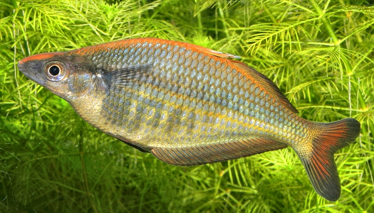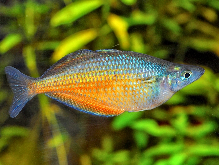 Heiko Bleher has collected live specimens for the aquarium trade from various locations in New Guinea. The latest colour variant was collect in 1999 from Kali Biru Lake (Lake Nenggwambu) in West Papua. He collected only males and had to return a second time in order to collect females. This variety has a broad orange stripe from the tip of its snout to the first dorsal fin. There is a vigorously flowing outlet stream, but no apparent inlet, indicative of a subterranean connection with neighbouring lakes via the limestone substratum. Water was relatively clear and maximum depth was estimated to be at least 10-15 metres, pH 7.8, and conductivity 60 µS/cm. The lake is surrounded by secondary forest and aquatic plants were abundant, but relatively few species were evident. Fishes were most strongly congregated around the outlet, where vegetation was very dense. Glossolepis dorityi was also collected from this location. Unfortunately, rainbowfishes currently being distributed in the hobby as Chilatherina fasciata [Kali Biru] appear to have been mixed with Chilatherina bleheri, based on genetic comparisons to wild fish. However, there are some genuine "Kali Biru" C. fasciata available in the hobby that were collected from Kali Biru, the Blue River, in 2010.