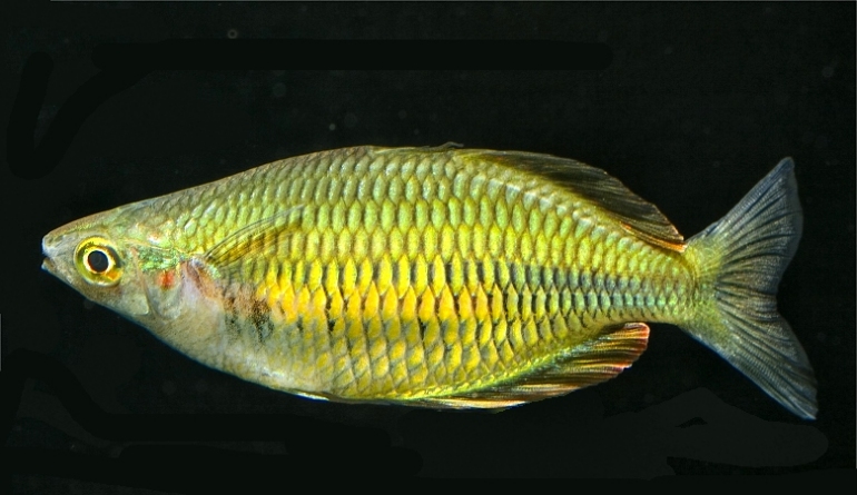 Melanotaenia flavipinnis was described from 20 specimens collected from two creeks on Misool Island in the Birds Head region of western New Guinea. Colour of adult males is: head brownish dorsally and on snout; preoperculum yellowish to white; operculum pale blue with dark blue stripe crossing uppermost portion with silvery white patch immediately below; green on dorsal half of body; pale yellow stripe between each scale row of body; dark blue midlateral stripe on posterior half of body, initially one scale row in width, but expanding to two rows (midlateral and row just below) on caudal peduncle; dark blue stripe on upper operculum continued just above and behind pectoral-fin base, incorporating 2-3 midlateral scales and connected to previously mentioned stripe by row of pale blue scales with dark blue margins; three lowermost horizontal scale rows of side with mauve streak on centre of each scale; side of breast bluish, sometimes with pink blush; dorsal, anal and pelvic-fins yellow; caudal-fin translucent grey to brownish; pectoral fins translucent. The colour pattern of the females are similar to that of males except sometimes lacking prominent dark blue midlateral stripe, in which case this feature is mainly light blue.