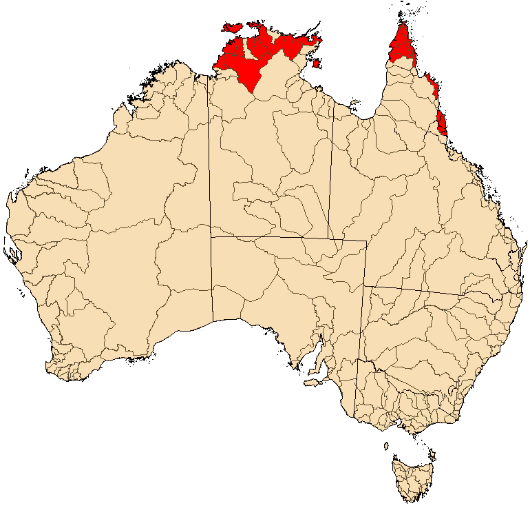 In Australia, Pseudomugil gertrudae has been found in scattered localities in river systems which flow into the Timor Sea and Gulf of Carpentaria - from Darwin through Kakadu and Arnhem Land to Cape York Peninsula, including the offshore islands of Bathurst, Melville and Groote Eylandt, plus some of the islands in the Torres Strait. They are widespread throughout Cape York Peninsula, extending down the eastern coastal plains to around the Innisfail - Tully region. Their known distribution within Australia includes the Adelaide, Alligator, Blyth, Buckingham, Cadell, Cato, Daly, Finniss, Liverpool, and the Moyle River systems in the Northern Territory; including the smaller catchments around Darwin. In Queensland they have been found in the Barron, Coen, Dulhunty, Embley, Endeavour, Jacky Jacky, Jardine, Johnstone, McIvor, Moresby, Mulgrave, Murray, Olive, Russell, Tully and Wenlock Rivers, plus the smaller coastal streams. They have also been found in oligotrophic sand dune lakes in the Cape Flattery and Shelburne Bay region. The known New Guinean distribution includes the Aru Islands, the Pahoturi, Fly (Elevala River, Lake Bosset) and Bensbach (Torassi) river systems. They probably occur elsewhere along the southern coast of New Guinea that has suitable habitat.