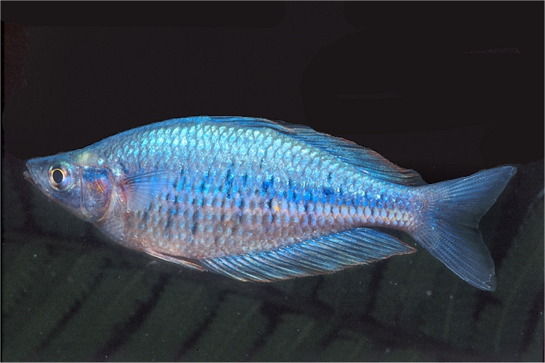 Glossolepis leggetti males have a body colouration that is iridescent green on the back, dull orange to whitish on the breast and lower sides. A diffused blue midlateral band, its colouration most intense posteriorly and bordered immediately below by narrower stripe of light metallic blue. Sides with scattered dark blue flecks or narrow bars. Fins generally translucent although dorsal and anal may be bluish, particularly in adult males. Females are the same colour, but less ornate with a narrow midlateral stripe and with the dark flecks and narrow bars on the side considerably reduced. May reach a maximum size of 10 cm, but usually less than 8 cm SL.
