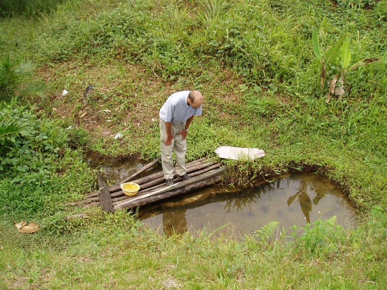 This little pool in Kiunga township contained Melanotaenia sexlineata - photo© Peter Hallas |