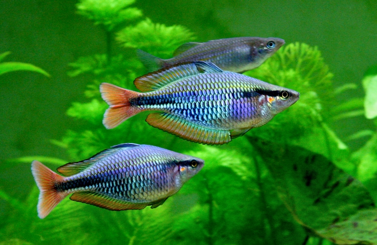 Melanotaenia picta males are a blue-grey colour dorsally on the head, nape and two uppermost, horizontal scale rows of back; cheek and operculum silver to grey with blood-red spot (about one-half pupil size) on the upper part of operculum; iris mostly pale yellow; side of body blue to pale grey with most scales broadly to narrowly edged with golden yellow; large patch of golden yellow on anterior body, just behind and above pectoral fin; golden yellow hues also evident along base of dorsal and caudal fins, and on membranous portion of dorsal and anal fins; fins otherwise blue-greyish except semitranslucent pectoral fins. Freshly collected live fish photographed in an aquarium generally blue-green to blue with metallic reflections and indication of darker blue mid-lateral stripe, most prominent on caudal peduncle where edged below with relatively broad white stripe. Juvenile with brown on back with pale green scale margins; sky-blue midlateral stripe edged above and below with yellow to orange stripe (one scale wide); median fins largely bluish. Male aquarium specimens kept in Germany for several years are largely various shades of blue with darker scale edges (especially bold on ventral side above the anal fin), a black stripe through the eye to just above the pectoral region, midlateral black stripe (about 2 scales wide) on the posterior body/caudal peduncle, and reddish dorsal, anal, and caudal fins.